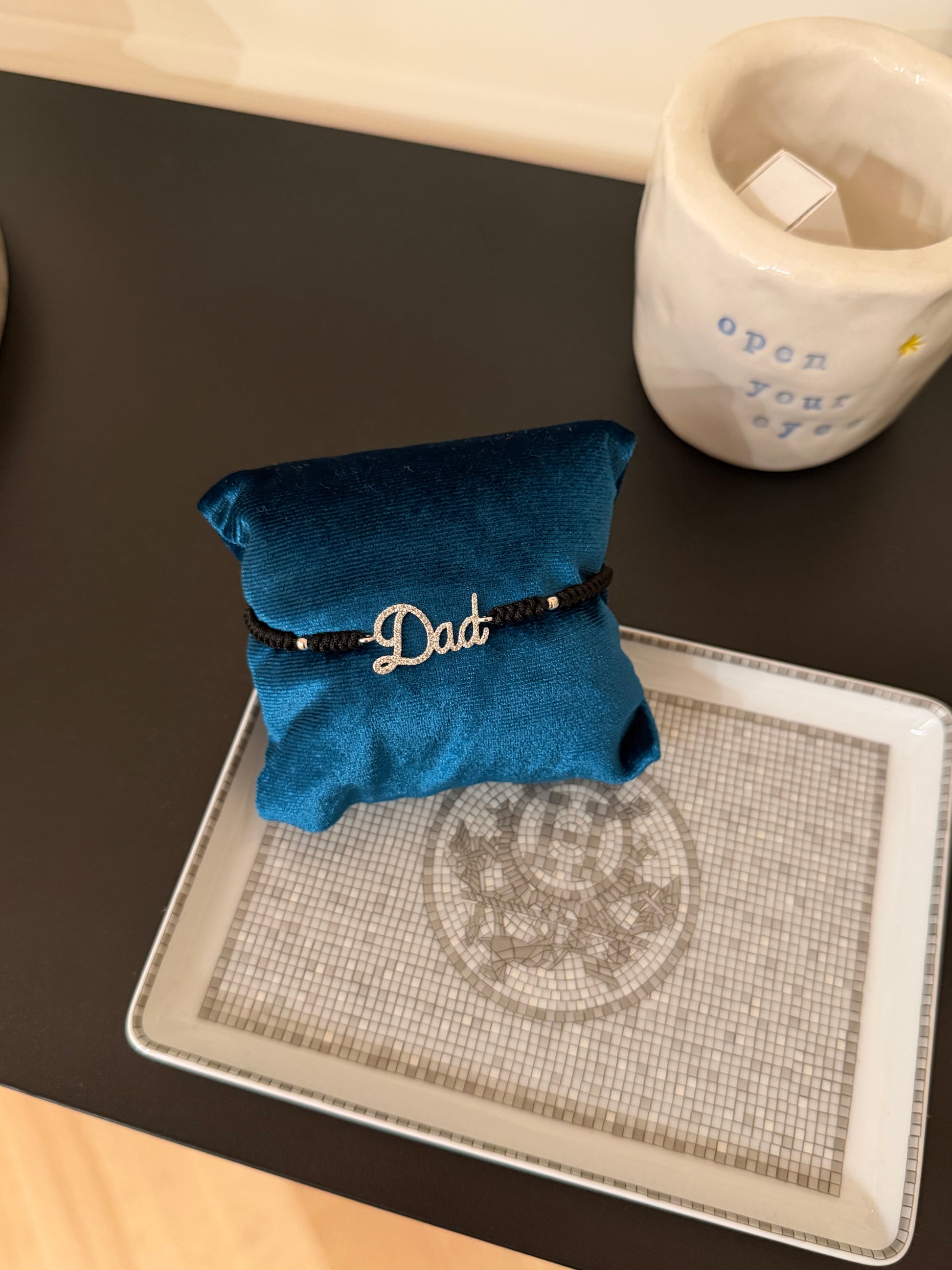 Bracciale in argento completamente tempestato di brillantini con cordino nero regolabile e inserti in argento 925.