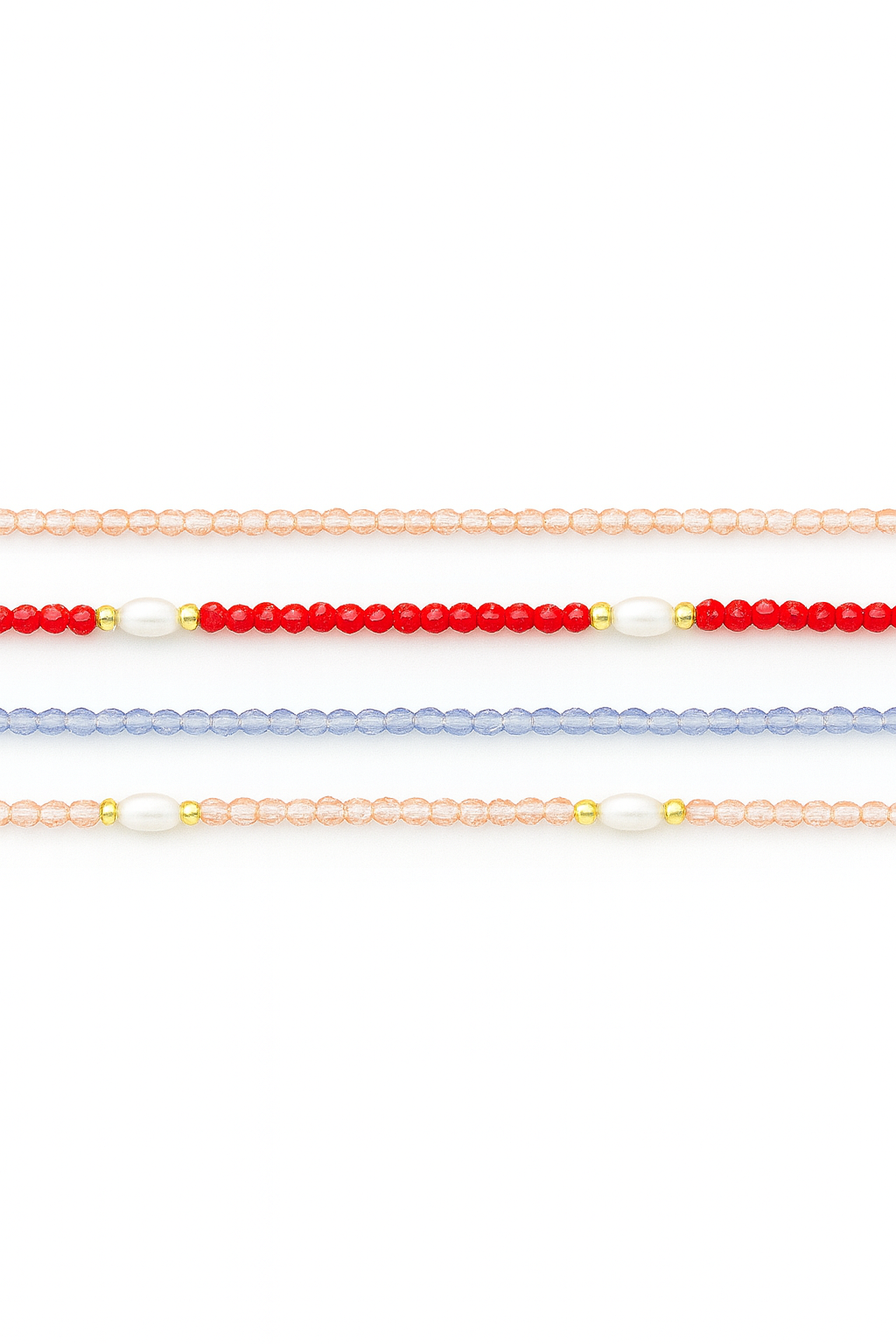 Cavigliera con cristalli colorati e perline chicchi di riso di acqua dolce. Con elementi e chiusura in argento 925 placcato in oro 18 carati