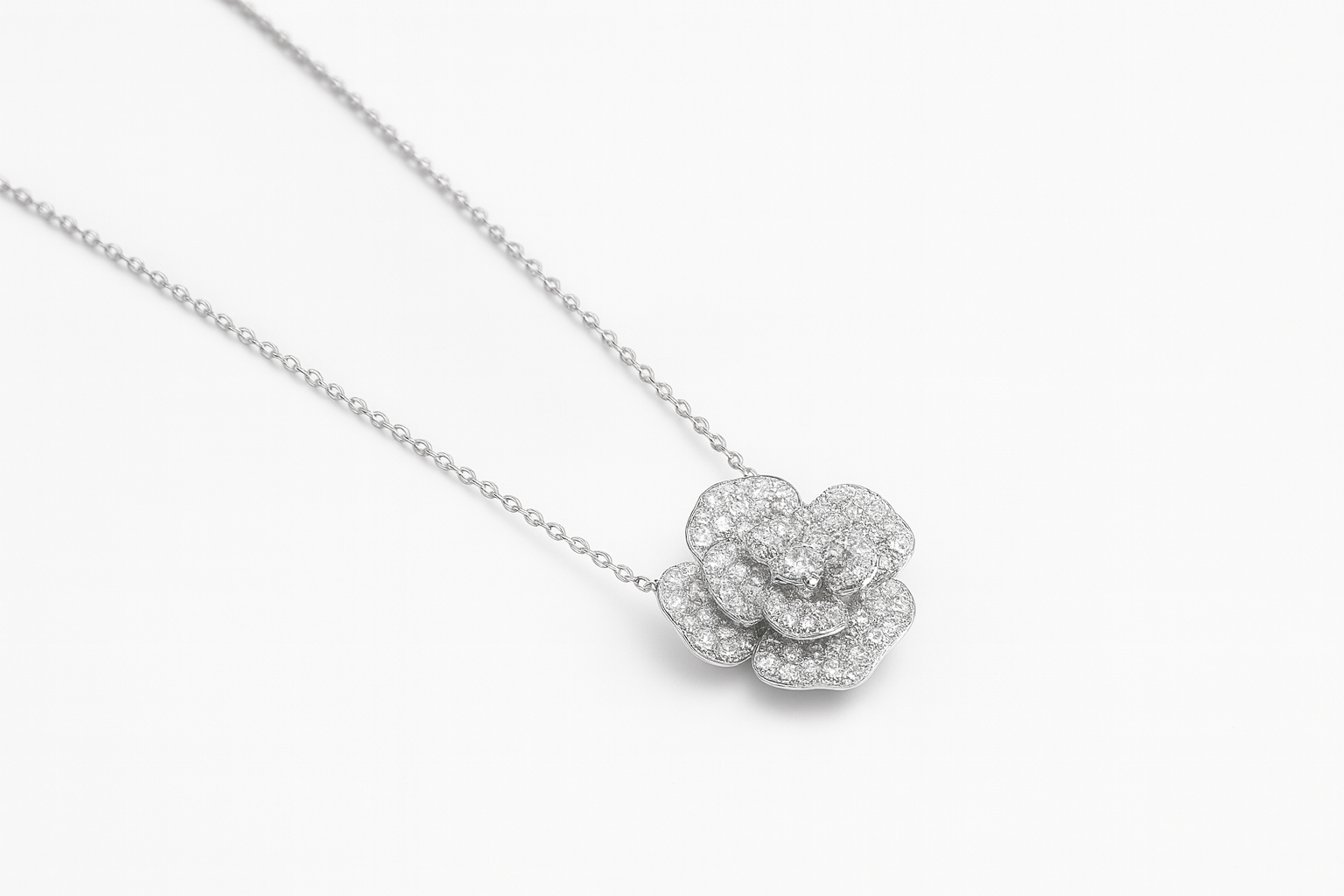 Collana in argento 925 con camelia completamente tempestata di brillantini e catenina con punti luce.