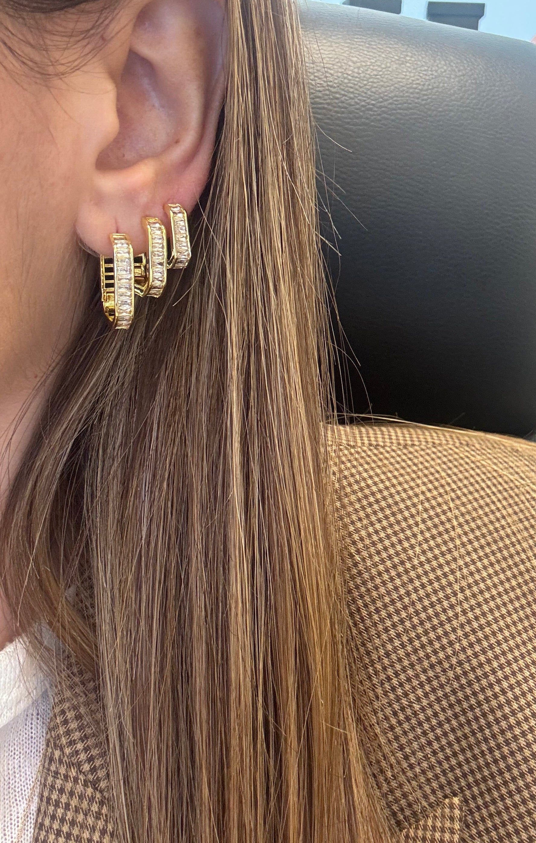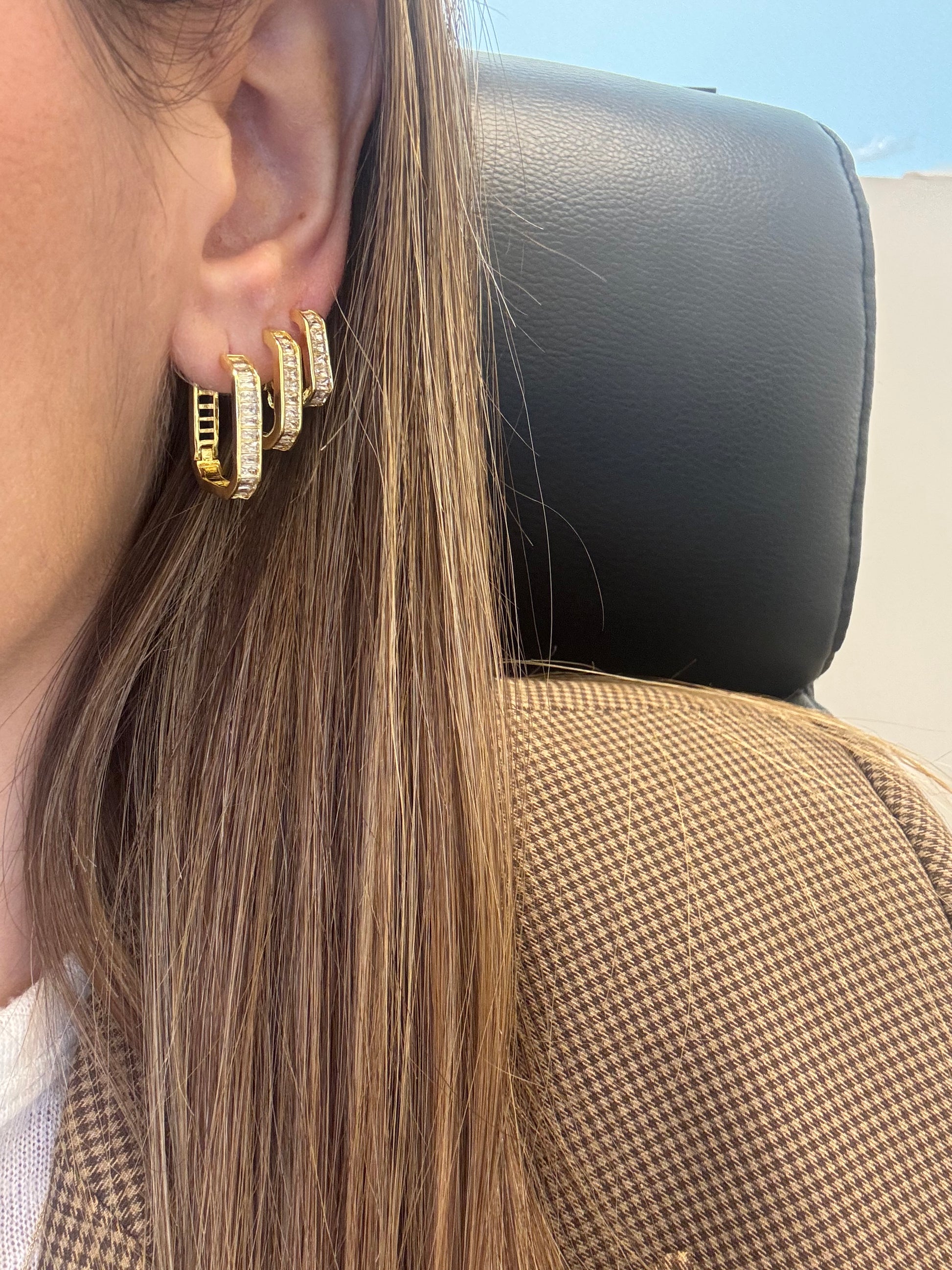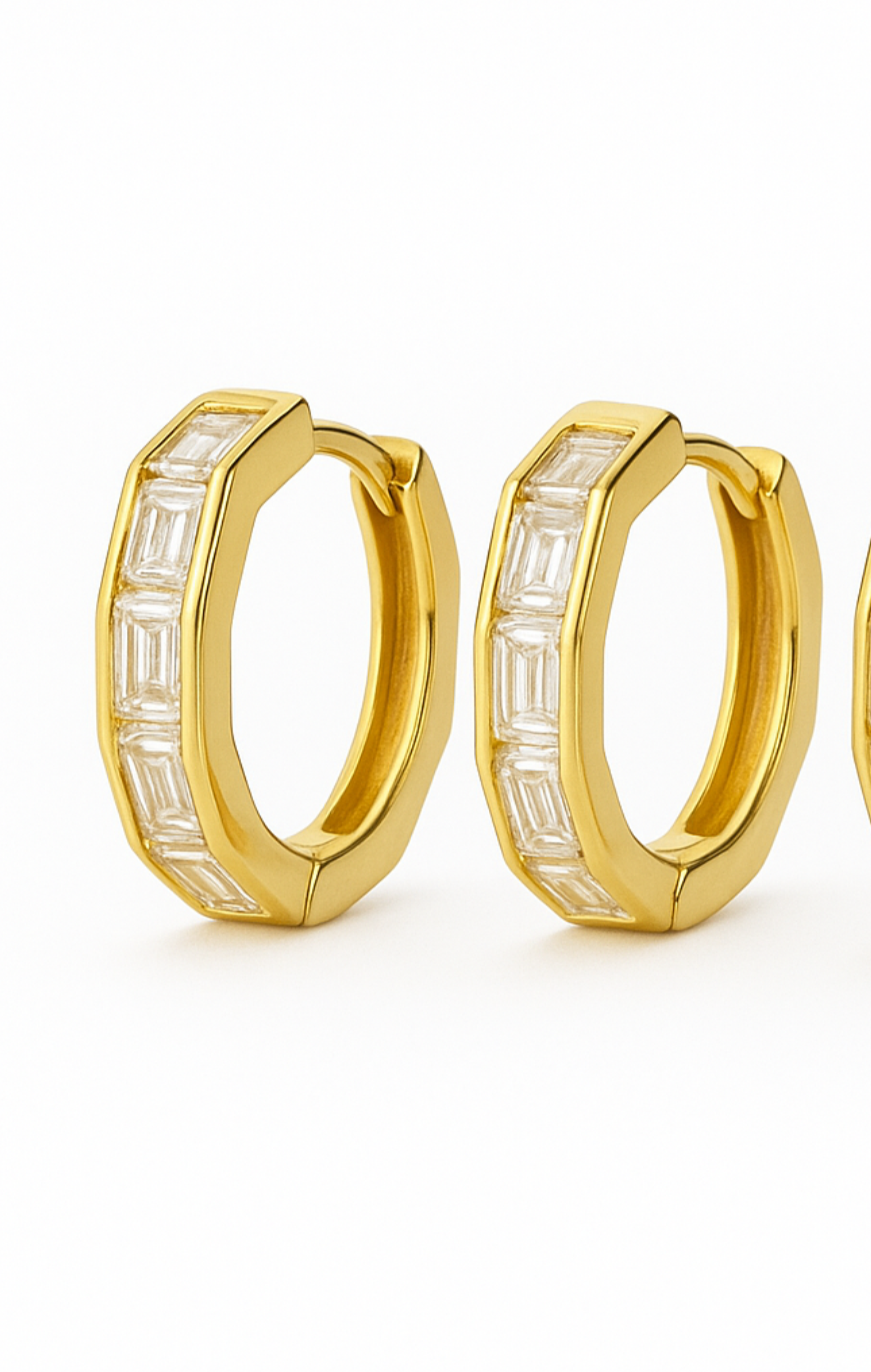 Orecchini cerchietti esagonali placcati in oro con pietre baguette.
