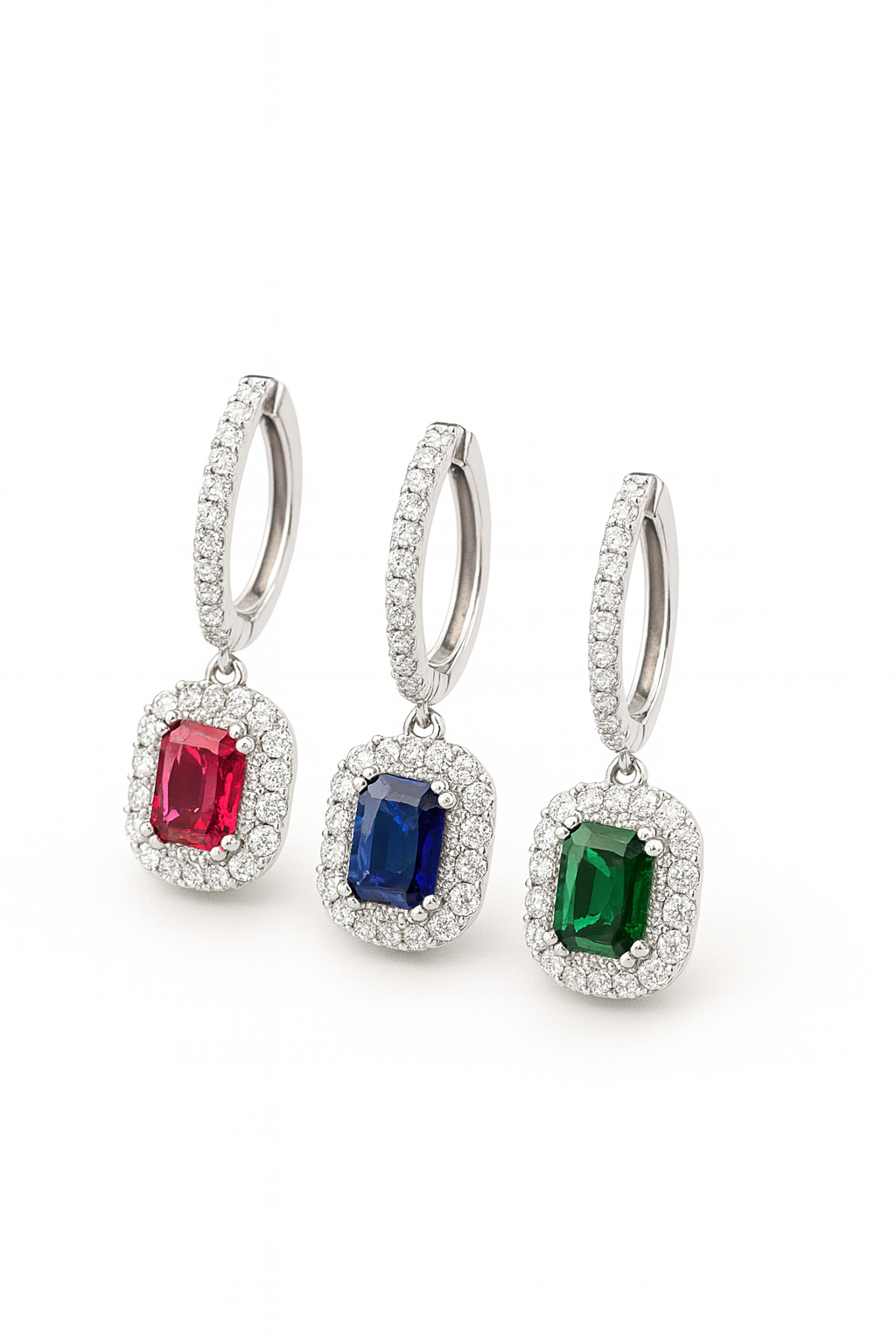 Orecchini in argento 925 cerchietti con brillantini con pendenti a pavè e pietra centrale colorata.