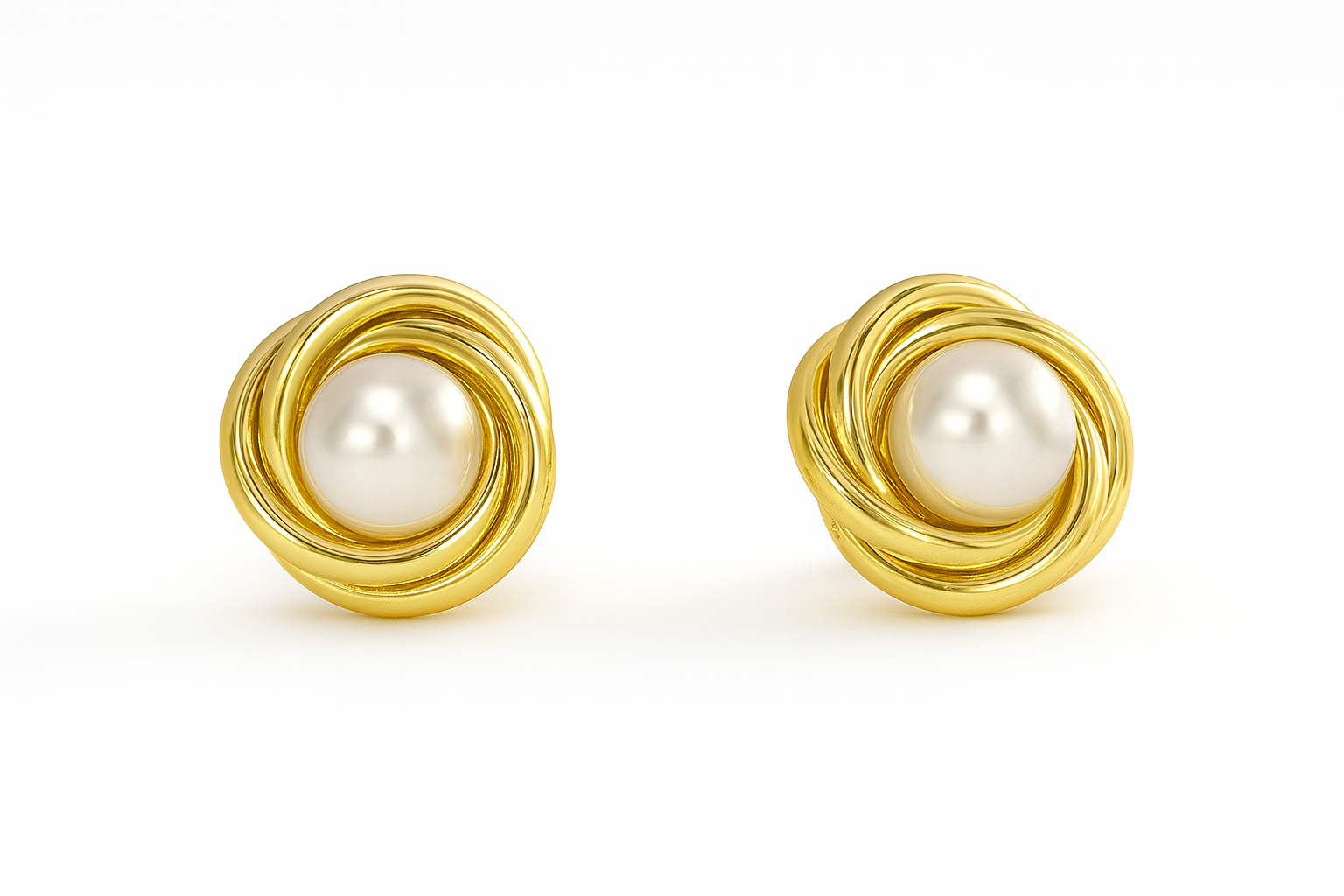 Orecchini a toppa con intreccio e perla centrale. placcati in oro 18 carati